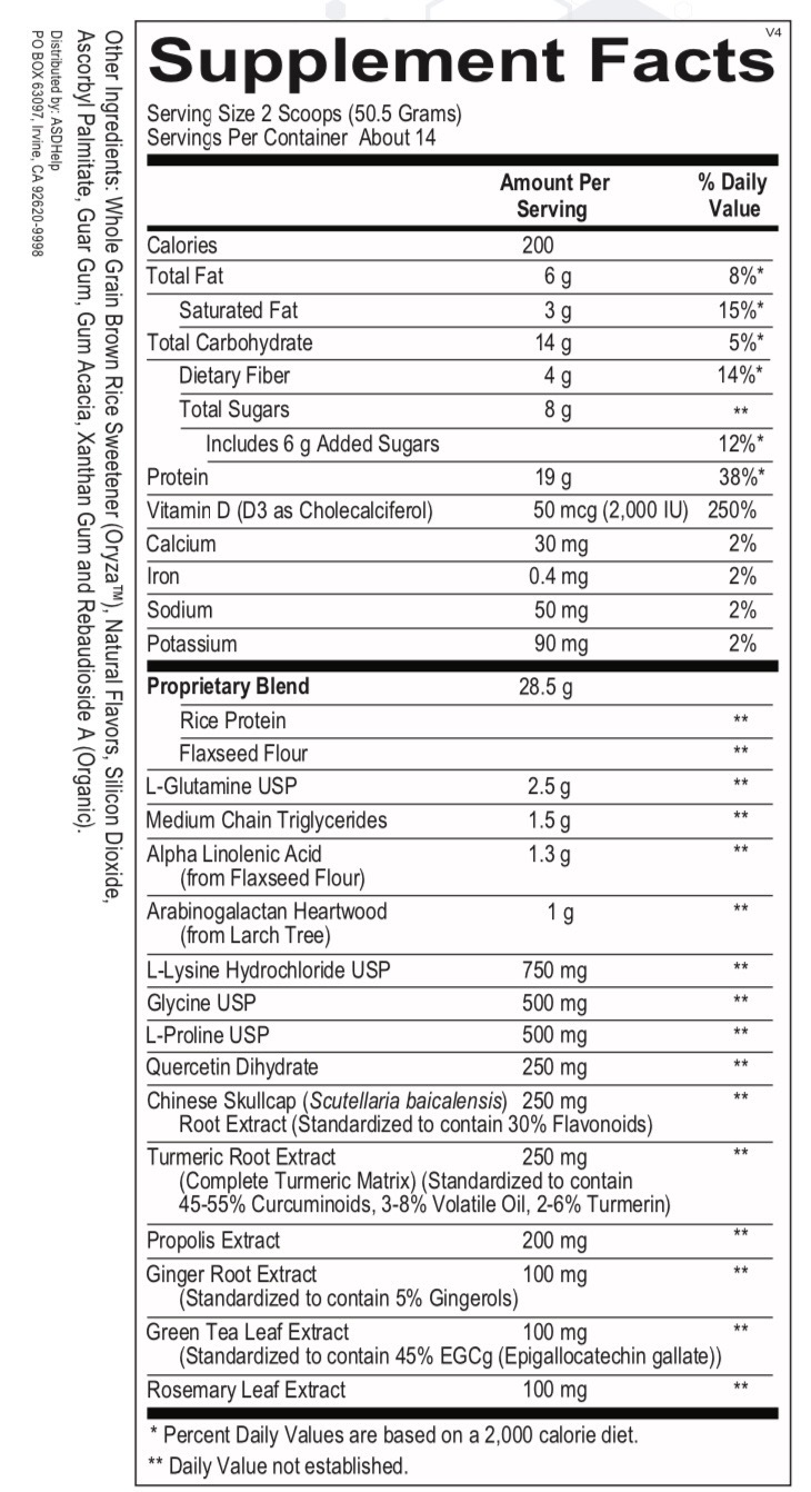 ✅ Уникальный состав: Каждая порция содержит 19 г легкоусвояемого белка из коричневого риса, L-глютамин и глицин для ремонта слизистой кишечника, куркумин (Complete Turmeric Matrix) для снижения воспаления, витамин D для укрепления барьера, волокна на основе льна для пищеварения, а также антиоксиданты и минералы. Без фруктозы, подслащено натурально. Произведено в США, протестировано на чистоту и безопасность.