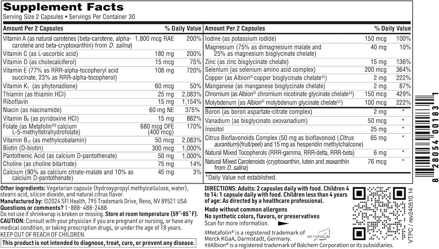 ✔️ Содержит витамин A (1800 мкг RAE), витамин C (180 мг), витамин D3 (15 мкг), витамин E (108 мг), фолат (680 мкг DFE как Metafolin®), витамин B12 (50 мкг) и другие ключевые нутриенты на порцию (2 капсулы)