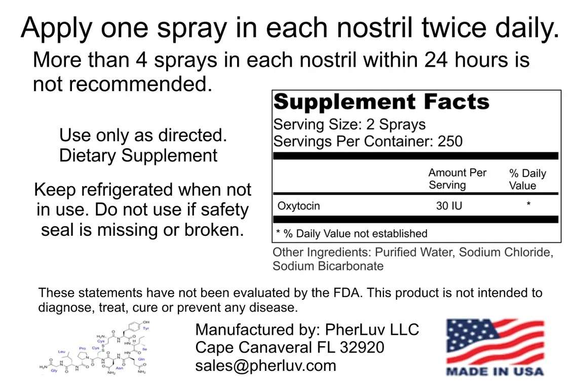 ✅ Уникальный состав: Каждая порция (1 распыление) содержит 15 IU чистого окситоцина для реальных результатов, без гомеопатических ускорителей. Формула разработана для быстрого всасывания через носовую слизистую, имитируя естественный гормональный эффект. Произведено в США, гарантирована чистота и качество ингредиентов, протестировано на безопасность.